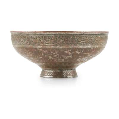 Note: The engraving of the hunting scene is of particularly high quality. For another similar-sized Safavid footed bowl, see Christie’s, Art and Textiles of the Islamic and Indian Worlds including works from the Collection of the late Simon Digby, 8 April 2011, lot 200 (sold for £3,000).