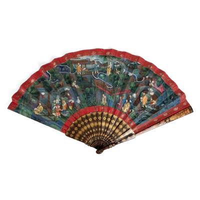 the black lacquer guards decorated in gilt and red with small houses in a landscape setting, the paper leaves painted to one side with a large bird with peonies against a silvery ground, the other side with 'thousand faces' design with various small figures in a garden setting