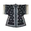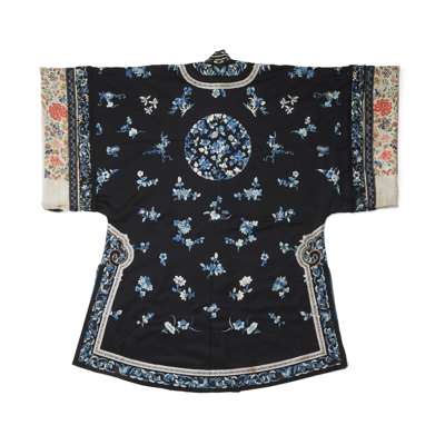 embroidered in mirror image front and back with lotus, chrysanthemum, morning glory, and other flower sprays, hemmed with a beige 'butterfly' band before a wider floral border, the sleeves upturned to reveal a pale blue silk damask worked in Peking knot with peonies and butterflies, lined in blue silk