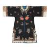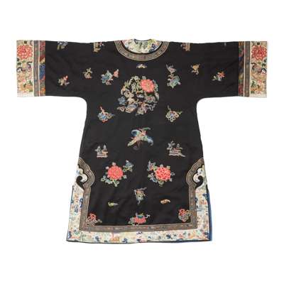 worked in Peking knot with blooming peonies, potted flowers, phoenixes, melons, auspicious symbols, and bats against the black silk ground, the sleeves ended with ivory-ground butterflies and peonies decorated wide bands, lined in blue silk damask patterned with repeated small motifs