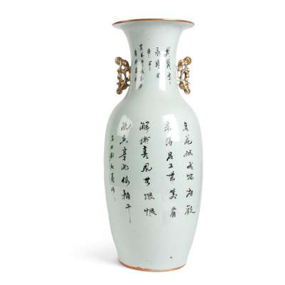 the body finely painted one side with a gathering of ladies in a garden setting, either dancing with fans in hand or reading poems, a celestial female immortal pouring various flowers from a basket above the cloud, the other side with inscriptions, the neck flanked with gilded ruyi fungus handles