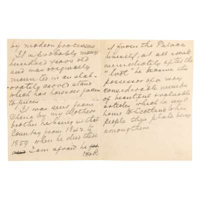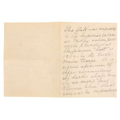 “This plate was originally in the Imperial palace... plunder... "loot" in 1859 by the Anglo-Franco troops. It is a fine specimen of copper enamelling, the darker shade being the so-called "lost Chinese blue" which cannot be reproduced by modern processes. It is probably many hundred years old and was originally mounted on an elaborately carved stand which has however fallen to pieces. It was sent from China by my mother's brother...in that country from 1842 to 1859 when he died there. I am afraid he took it from the Palace himself... after the loot he became the possessor of a very considerable number of beautiful and valuable articles which he sent home to Scotland... this plate being amongst them."