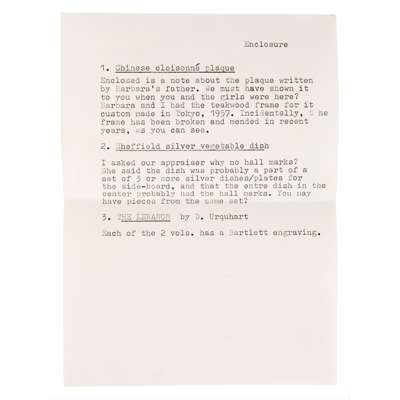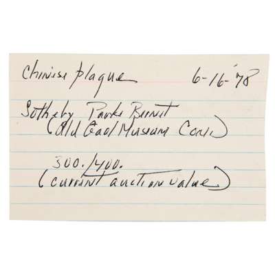 With another handwritten note dated to 16 June 1978: "Chinese plaque, Sotheby Parke Bernet (Old Gaol Museum Com.) 300/400 (current auction value)"