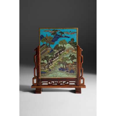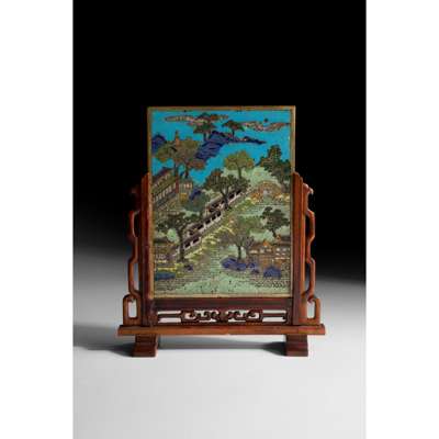 清 銅胎掐絲琺瑯山水庭院及花鳥紋插屏