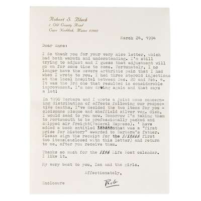 With a typed letter dated to 24 March 1994 from Robert S. Black, mentioning: "Barbara and I had the teakwood frame for it custom made in Tokyo, 1957."