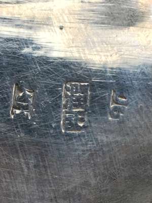 comprising: one set with a lidded teapot, a milk jar, a sugar bowl and a circular tripod tray, each minutely engraved with flower motifs, the base of the tray marked 'WH 90' and a single-character Chinese mark; the other set with a cylindrical lidded teapot, two hexagonal cups, all contained in a hamper hallmarked 'Run Ji' and '90' on the base