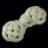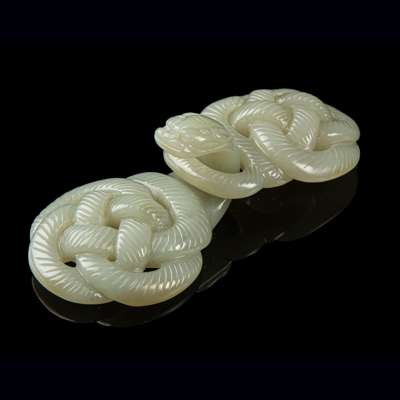 composed in two parts, one part carved in openwork with a form of sinuous chi dragon with its body knotted in lobed geometric form and its head forming the hook, the other part similarly with a knotted body in openwork and a looped end, the stone of even celadon colour