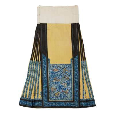 TWO HAN CHINESE WOMAN'S EMBROIDERED YELLOW SILK PLEATED SKIRTS