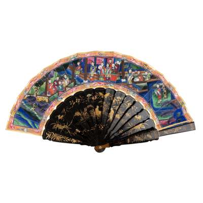 CANTON LACQUERED AND PAPER 'LANDSCAPE' FAN