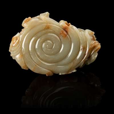 carved as an oval bamboo-woven fish cage, the base supported by a pool of swirling waves, the sides further adorned with a fish, two crabs and a lotus bud popping out from the waves in high relief, the stone of greyish celadon tone with russet patches