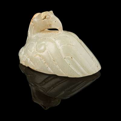 carved in the round as a turtledove with a long beak and looking backwards, the body finely carved in low relief with feathered wings, the flattened base carved with a circle and two apertures for fitting onto staff, the translucent white stone with a slight green tinge and russet inclusions
