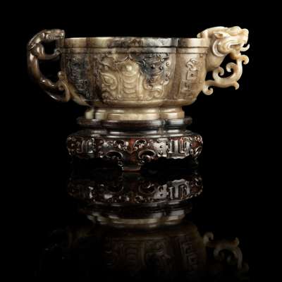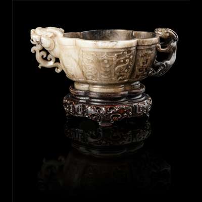 raised on a stepped ring foot, the quatrefoil form cup carved in low relief on either side with an archaic taotie mask flanked by a stylised phoenix head, the vessel flanked with a chilong clambering up from the bottom to the slightly everted rim on one side, the other side carved with a protruding horned dragon head forming handles, the creamy-white stone has some dark brown russet section, with a fitted wooden stand