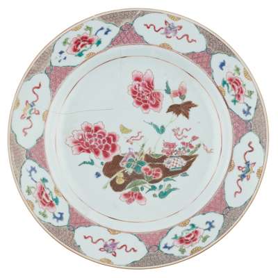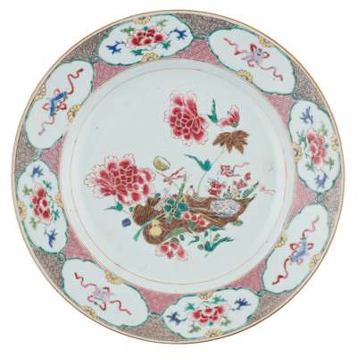 each painted to the central medallion with attributes of Eight Daoist Immortals, including a double-gourd, sword, plantain fan, fish drum, flute, castanets, basket of flowers, and lotus, all borne on ribbons, resting on a large leaf issuing out luscious peonies, all beneath floral and auspicious emblem panels against a pink diaper and swirling ground band