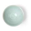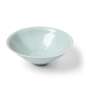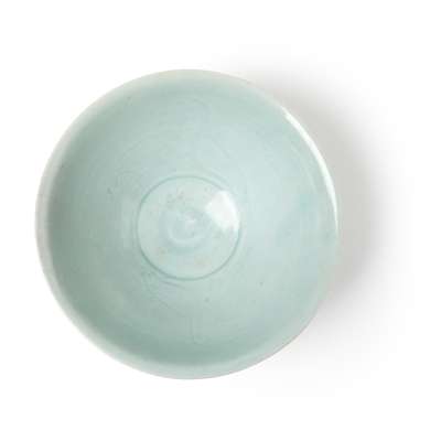 of conical form with gently everted rim, the interior carved freely with a lively leaping pair of carps on a neatly combed wave ground, applied overall with an elegant pale blue glaze tinged with green, the flat foot unglazed, the base with remnant of an old label ‘R.F.A. Riesc.. No. 116’