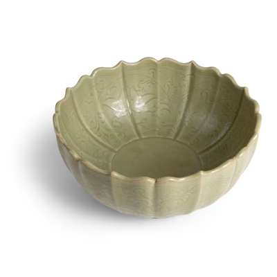 LARGE LONGQUAN CELADON CARVED 'FLOWER' FOLIATED BOWL