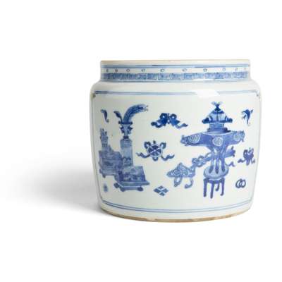the tapering cylindrical body rising to a short neck, the sides decorated with two cartouches, respectively painted with various antiquities and small figures in a landscape setting, flanked by longevity character, all below a key-fret band