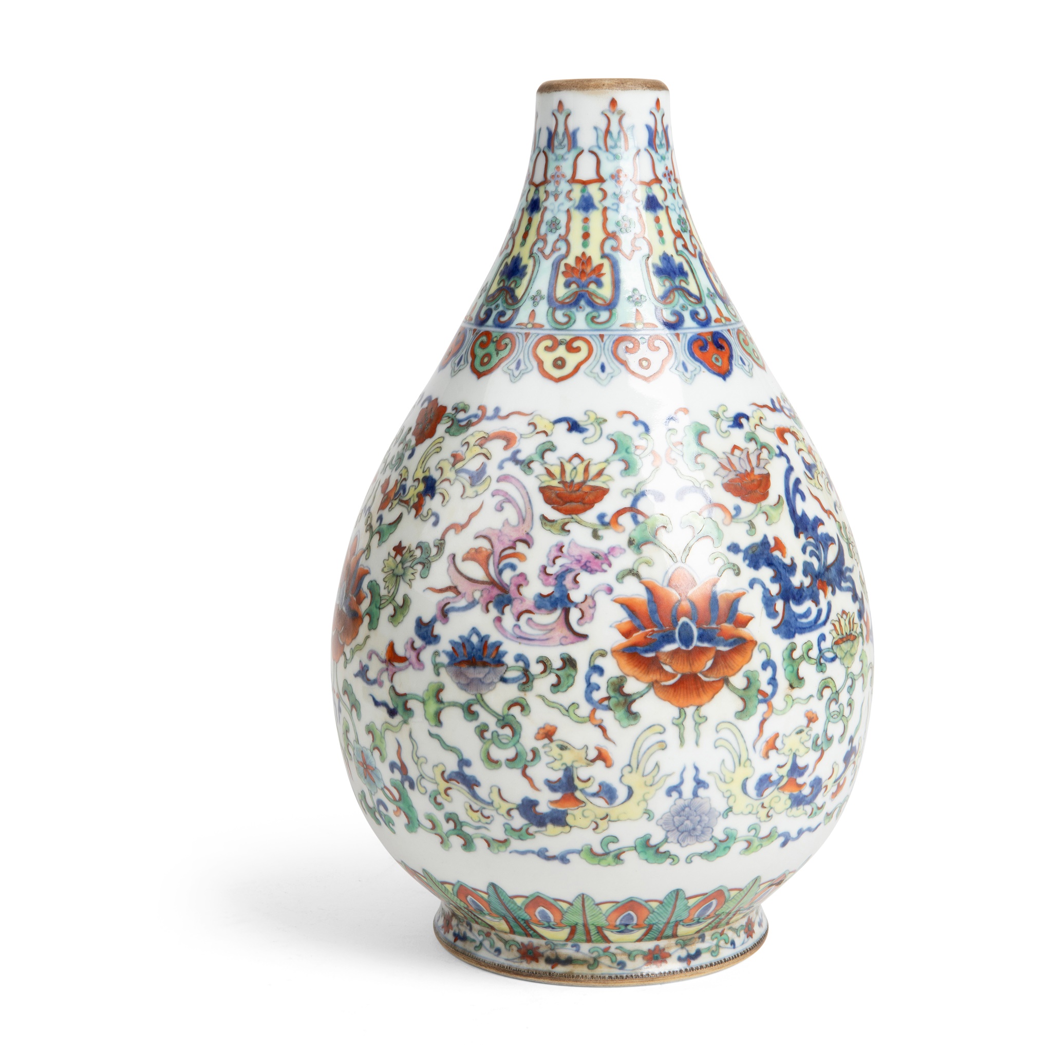 of bottle form, painted with stylised phoenixes amongst dense flower heads borne on scrolling tendrils, all between ruyi and plantain leaf bands