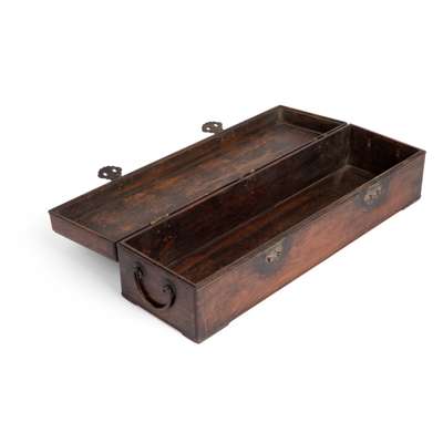 of plain, rectangular form, the faces dovetailed together, the lip of both the box and cover with beaded edge, the cover hinged to the box, the front with two ruyi-form locks against circular plates, with suspended c-shaped handles on either end