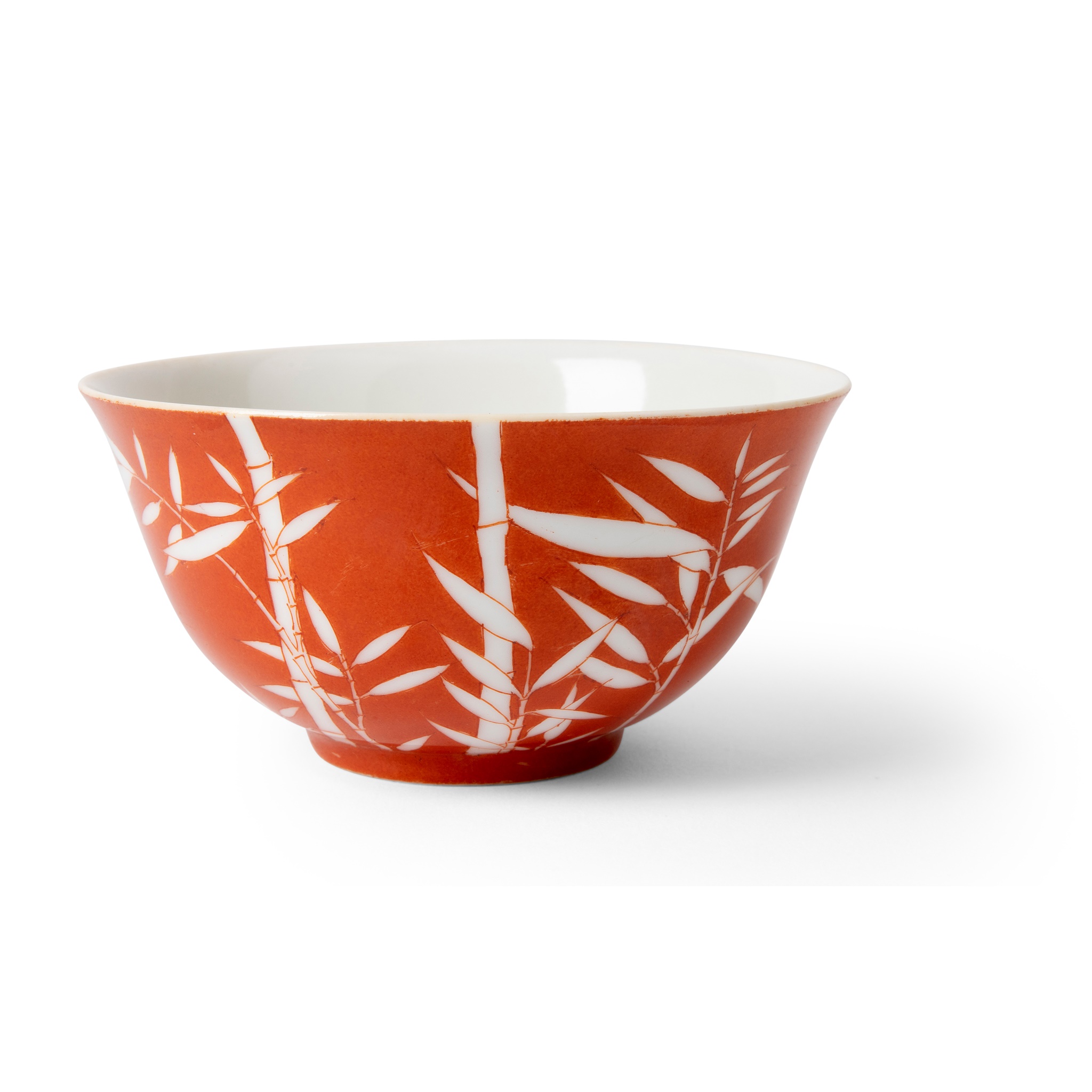 finely potted with deep rounded sides rising from a short straight foot, reserve painted in rich coral-red with leafy bamboo branches, the interior glazed white, the base inscribed with a six-character Daoguang mark in underglaze blue