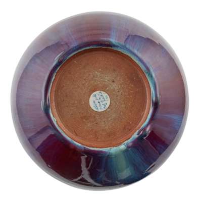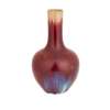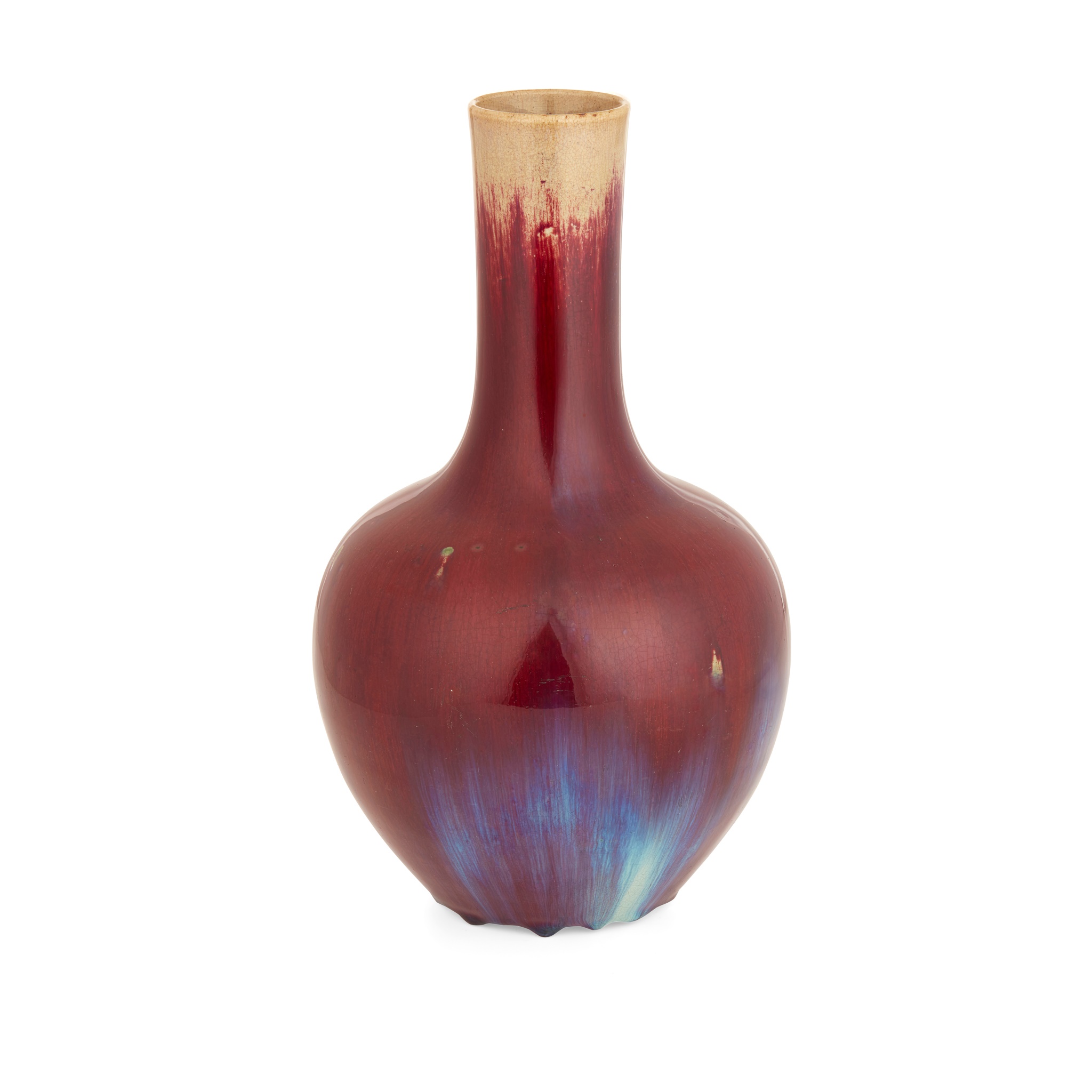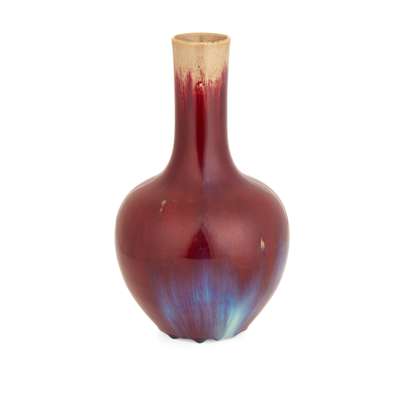 heavily potted with globular body rising to a long cylindrical neck, covered overall with an uneven red glaze suffused with lavender and blue streaks, the glaze thinning on the mouth revealing a yellowish-brown coloured body, the thick glaze pooling and forming the foot, the unglazed base revealing the brownish buff body