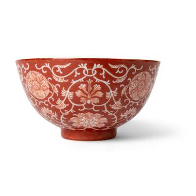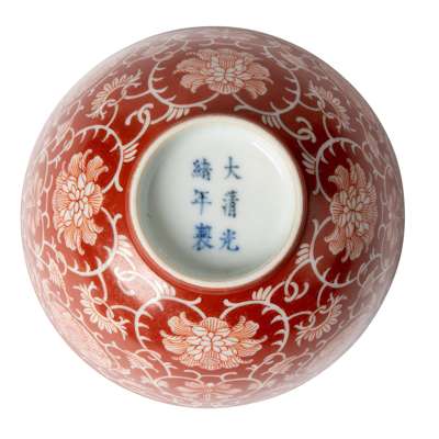 清光緒款及年代 珊瑚紅地留白纏枝連紋碗