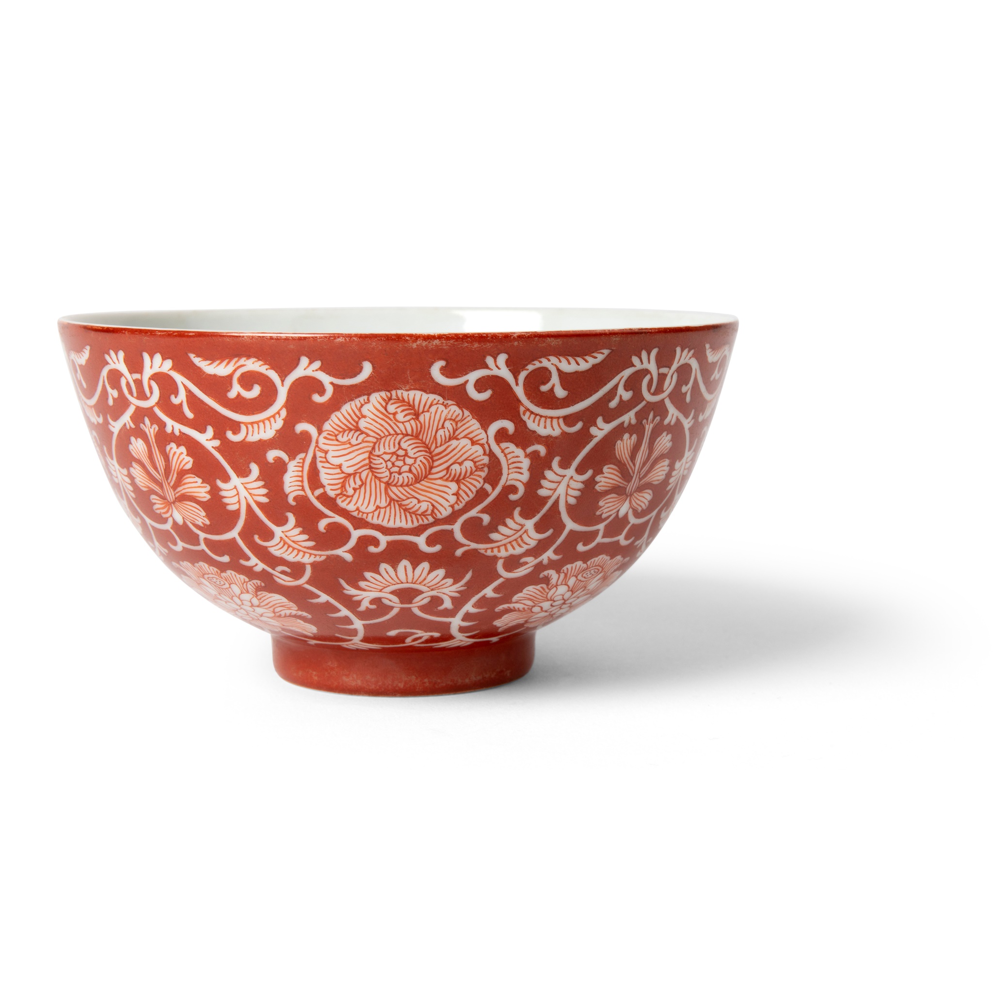 finely potted with deep rounded sides rising from a short straight foot, reserve painted in rich coral-red with blossoming lotus flower in tendrils, the interior glazed white, the base inscribed with a six-character Guangxu mark in underglaze blue