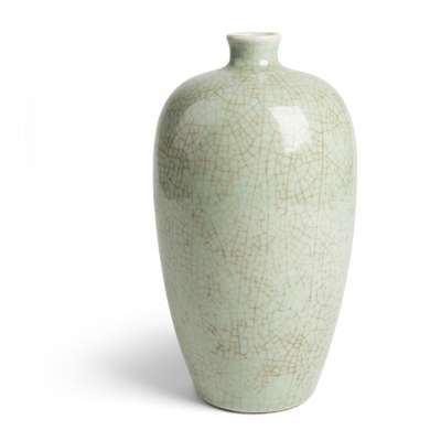 of spindle shape, the high shouldered body rising smoothly to a waisted neck and terminating to a flared rim, the exterior covered in a thick layer of light greyish glaze with greenish tinge suffused with a network of russet crackle, the sunken base applied with white glaze