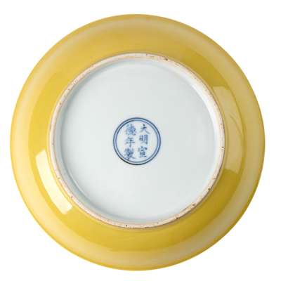 with rounded sides rising from the short, tapering foot, covered in a rich yellow glaze save for the white-glazed base, inscribed with a six-character Xuande mark within a double circle in underglaze blue