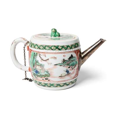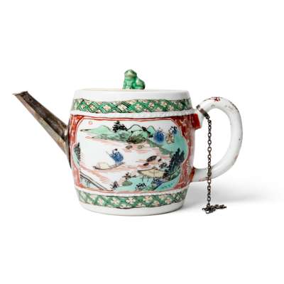 清康熙 五彩開光山水人物紋鼓式茶壺(含後嵌銀壺嘴)