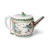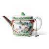 finely painted on either side with small figures in a mountainous landscape in a cartouche, the top and bottom of the teapot moulded with raised bosses, the cover similarly decorated with a lion finial, attached with a loop handle, mounted with a silver straight spout