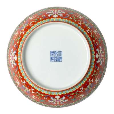 清 乾隆款 珊瑚紅地粉彩番蓮紋五福捧壽盤