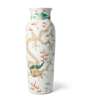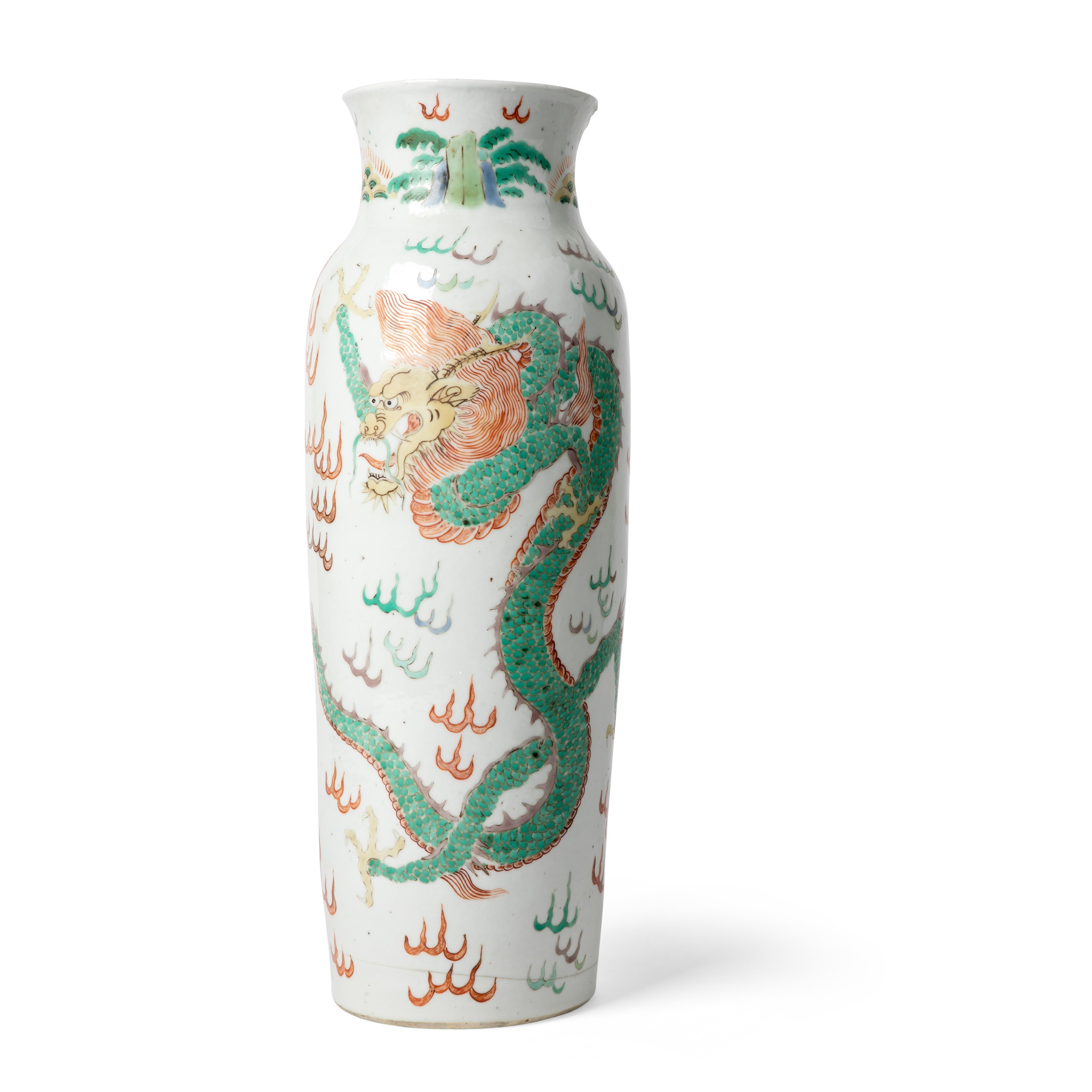 the elongated body extending towards a short neck and terminating into an everted mouth rim, the exterior painted with two sinuous four-clawed dragons in green and red, all below a mountain-and-wave decoration around the neck