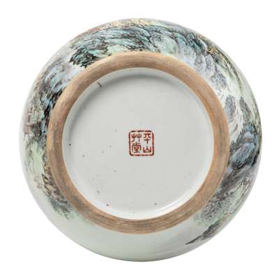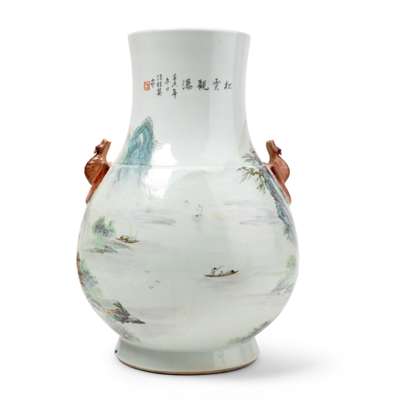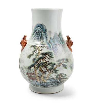 the bulbous body supported on a splayed foot and terminating into an everted rim, the exterior painted on one side with a waterfall and large pine trees in a mountainous landscape, the other side with small figures on sampans on the river, inscribed with the title and the year of Xin Chou, corresponding to 1991AD, and signed Wang Gui Ying (1931-2012), the waisted shoulder flanked by two moulded bats, the base inscribed with a four-character 'Ping Shan Cao Tang' mark in square in iron-red