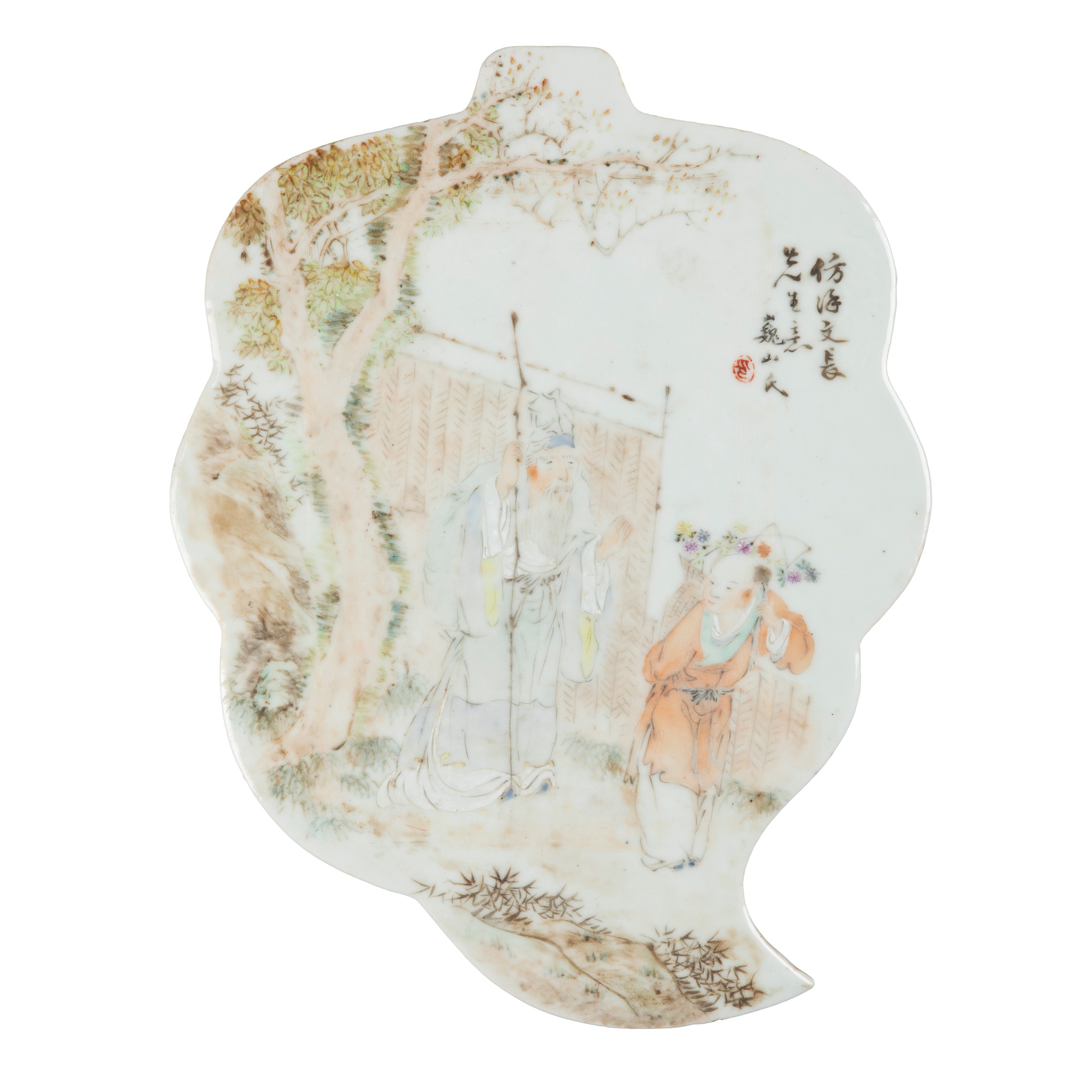 十九至二十世紀 巍山氏款 淺絳彩高士紋葉形瓷板