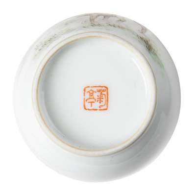 thinly potted, the exterior finely painted with a herdboy riding a buffalo in a paddy field, all under a large tree, the top right inscribed and including the year of Bing Zi, corresponding to 1936, the base inscribed with a two-character mark 'Ju Ting' in a square in iron-red