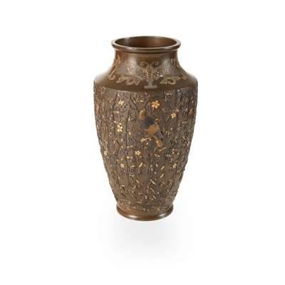 of baluster form, the exterior decorated with a continuous scene of draping branches bearing blossoming flowers, one side with a tree perched by a bird, all applied in silver shakudo and gold takazogan mixed-metals, all against a finely chiselled ground, the neck further adorned with two moths with flowers in tendrils, the base unmarked
