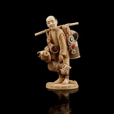 Note: Compare to a similar example in the same size of a carved ivory street vendor by Eishin sold at Bonhams London, 15 May 2014, lot 320