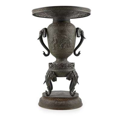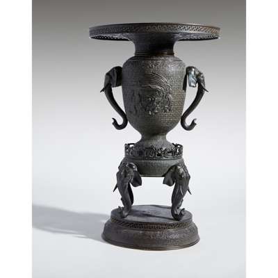 constructed in three parts comprising a base, main body and rim, the stepped circular base set with four adorned elephant heads as feet further supporting a ring stand, the body of baluster form flanked by large pairs of elephant heads with sinuous trunks as handles, each side decorated with a winged-dragon in relief, the namesake 'thin-rim' with openwork swastikas around the edge, the upper surface plain, lower with a band of auspicious clouds in relief, all decorations reserved on a geometric ground, underside of the main body marked 'Seimin ju' (cast by Seimin)