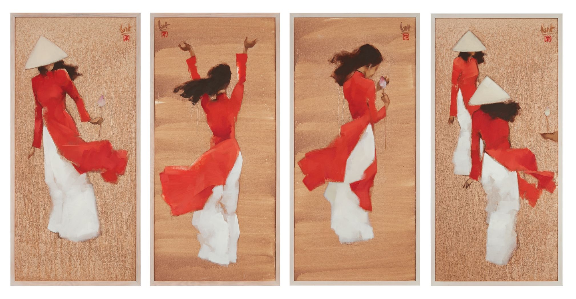 set of four oil on canvas paintings, signed upper left and right with 'Binh' and ‘平’, framed