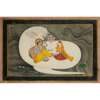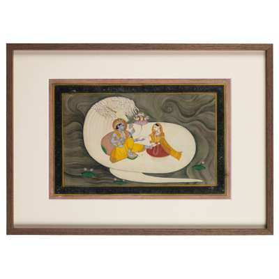gouache and gold on paper, depicting Vishnu dressed in a yellow dhoti with golden crown and holding his implements, a lotus stem issues from him supporting a pink blossom and the four-headed Brahma, his feet are being massaged by Lakshmi, all within an ocean setting, yellow and blue margins, framed