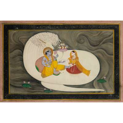 A PAINTING OF ANANTASAYANA: VISHNU RECLINING AGAINST THE GIANT HOOD OF THE SERPENT SHESHA WITH LAKSHMI