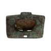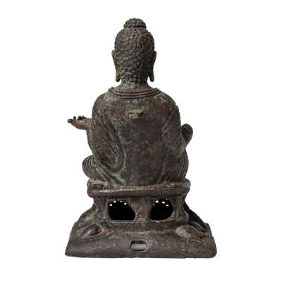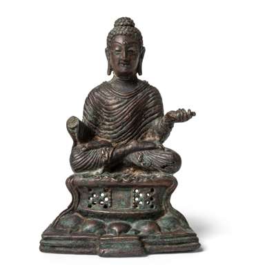 Offered here is a seated Buddha cast in copper alloy, the usual material for Swat Valley sculptures, covered in dark brown and a touch of forest-green patina. This finely modelled figure is a classic rendition of Buddha Shakyamuni. The Buddha is shown seated on a throne supported on a single lotus base and the large lotus petals are bulbous, polished and smooth, contrasting with the robe he wears with rippling folds. He holds the hem of his robe with his left hand. This gesture is widely employed in seated Swat Buddhas, extending the style from earlier Gandharan stone images. His face peacefully rendered, the cavity in his eyes suggests that they might have been inlaid with silver, a common finish to celebrate Buddha's enlightened nature in Swat figures.