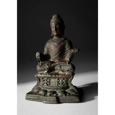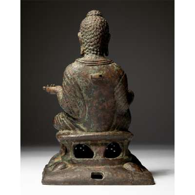 Comparable to a Swat Valley copper alloy seated Shakyamuni, 8th-9th century, which was sold at Bonham's Hong Kong, 2 Dec 2021, lot 1007; another silver-inlaid bronze figure of Buddha Shakyamuni, 7th century, was sold at Christie's New York, 15 Mar 2016, lot 44. See gilded, partial gilded and copper alloy Swat Valley figures of seated Shakyamuni in Himalayan Art Resources, item no. 1636, 9342, and 20105.