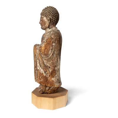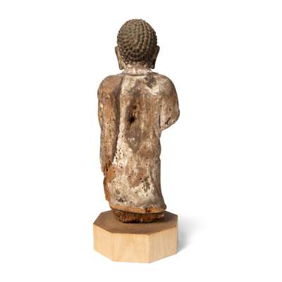 standing upright, the demure face carved with elongated eyes, arched brows flanked by pendulous earlobes, the hair arranged in tight curls with an ushnisha, on a later wooden stand