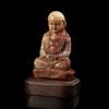 seated in dhyanasana pose with dhyana mudra, wearing a robe falling in naturalistic folds around the arms and legs and open at the bejewelled chest, the face has a serene expression with well-defined features and downcast eyes, the hair neatly arranged under headcover, with a wooden base