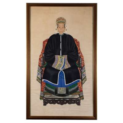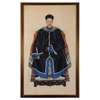 ink and colour on papers, one painted with a seated male court official holding a folded fan in his right hand, rosary beads in the left, wearing a fur-lined black robe; the other painted with a female figure similarly dressed with elaborate sleeves and green pleated shirt, framed