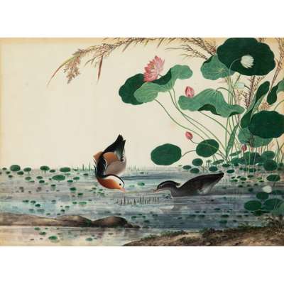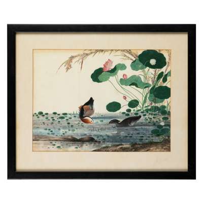 comprising: two depicting luscious exotic fruits, one including lychee, pomegranate, grape, lemon, berry, and others borne on foliage and flowers, written in pencil with 'Lichee Pomegranate' on the lower-left, the other similarly composed and including melons, dates, tangerines, both paper impressed with 'WKing 1829' watermark; the other two paintings with birds, one with a pair of Mandarin ducks on a lotus pond, the other with a pair of blue magpies elegantly perched on a twig
