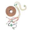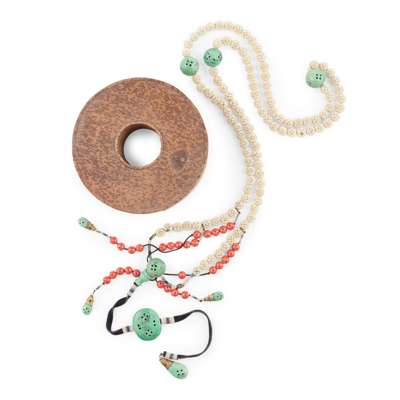 the court necklace comprising one hundred and eight carved ivory beads spaced with larger turquoise coloured beads, auxiliary tassels adorned with coral coloured beads, with an original box