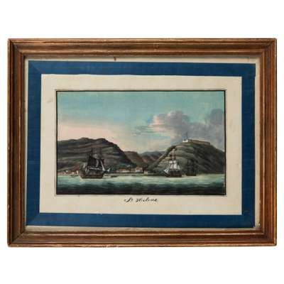 Note: Saint Helena is a British possession in the South Atlantic Ocean. Compare to a Chinese School oil painting on brass, dated to the early 19th century, depicting St Helena from a different perspective with the bay and junks flying the Red Ensign flag, which was part of a group painting sold at Christie's London, 7 Nov 2019, lot 9. The St Helena view is a copy of plate 2 ('The Roads, St Helena') of George Hutchins Belassis's Views of Saint Helena, published London, 1 Nov. 1815, for which see R.F. Kennedy, Ibid, B235.