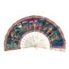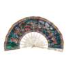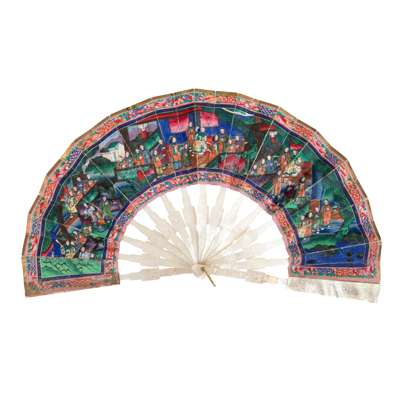 the fan leaves brightly painted on both sides with figures amongst elaborate terraced pavilions, each figure with finely detailed faces and applied silk clothing, the guards and sticks made of mother of pearl carved in low relief with small figures in a garden setting, the paper leaves could be moved up and down to expand the dimension of the fan